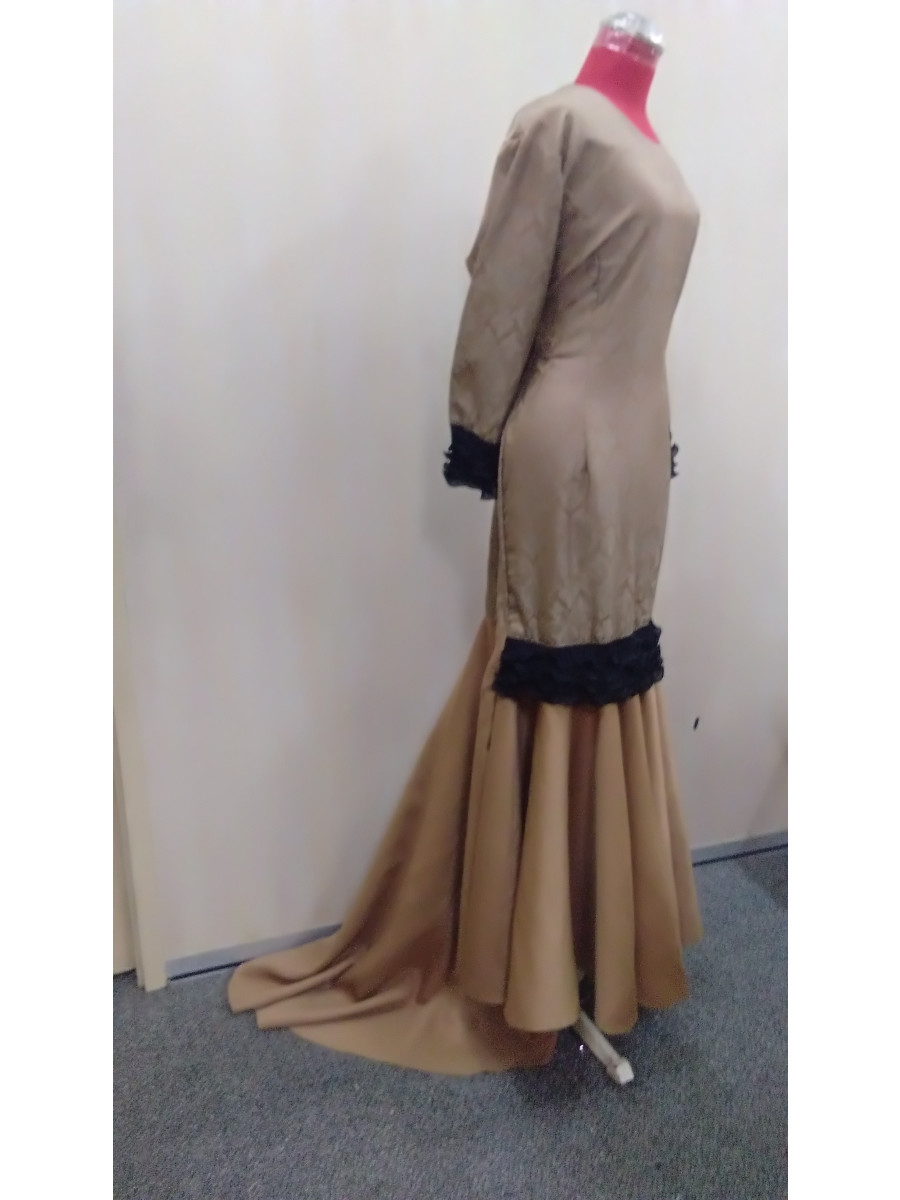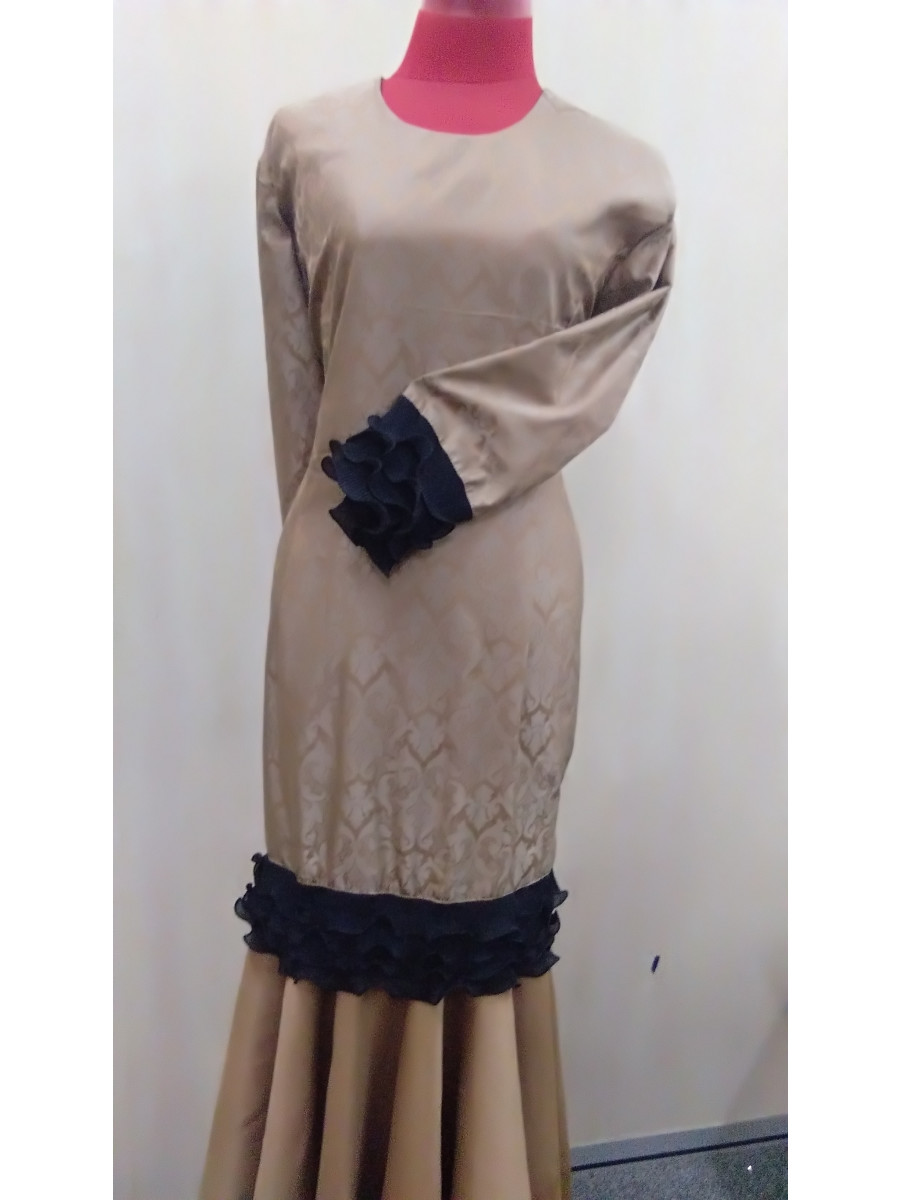 Dress cut lutut. Ropol di bahagian hjg tgn dan lutut. Sedikit meleret di bahagian belakang.