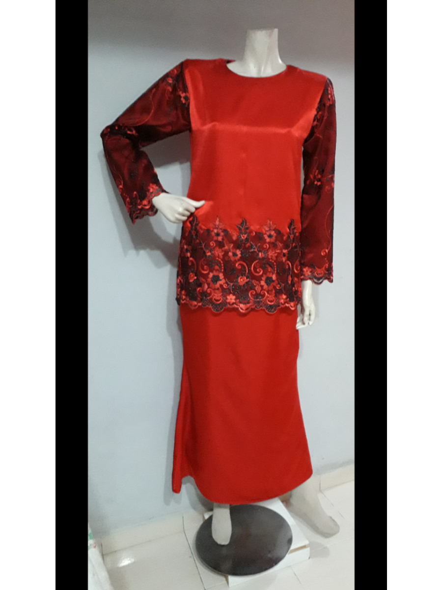 Mini kurung moden kain duyung, berlace. Leher bermata lalat