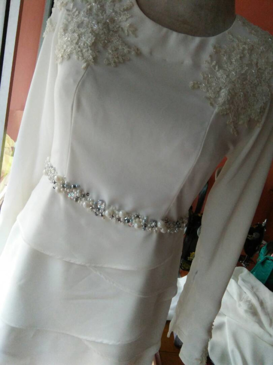 Baju kurung tulip ini diserlahkan lagi dengan taburan pearl dibahagian pinggang untuk menimbulkan lagi belahan (tulip) dibahagian kaki baju. Baju ini dipadankan dengan kain panel supaya nampak lebih flowy dan elegan.