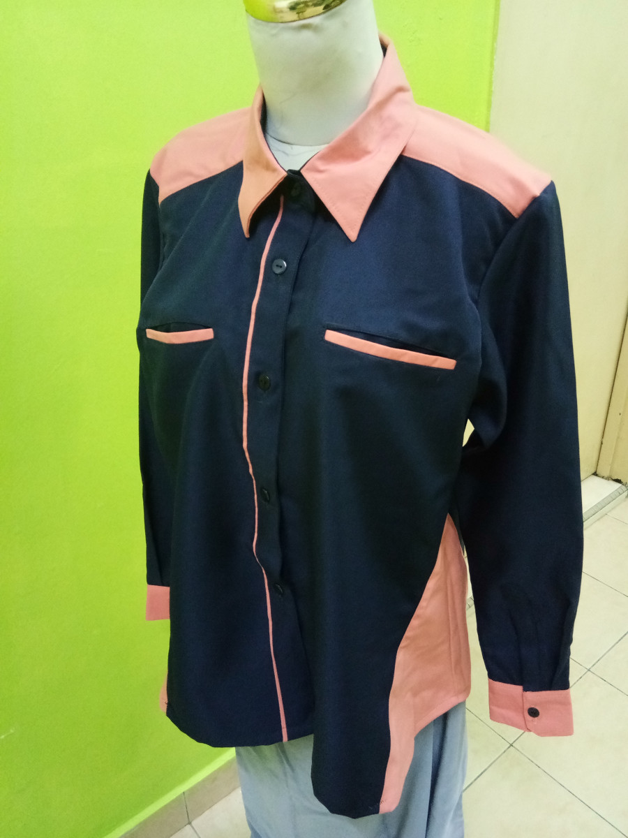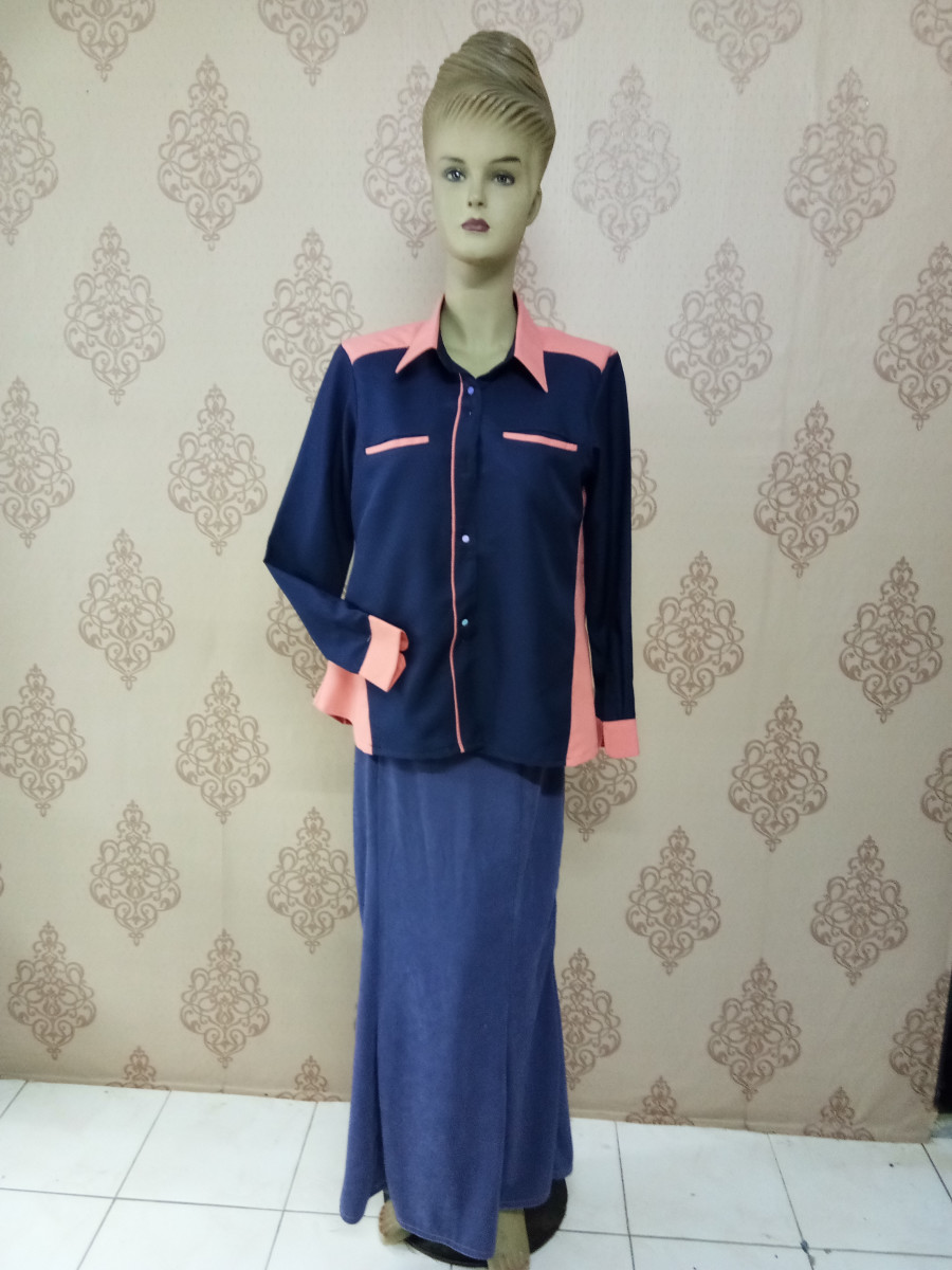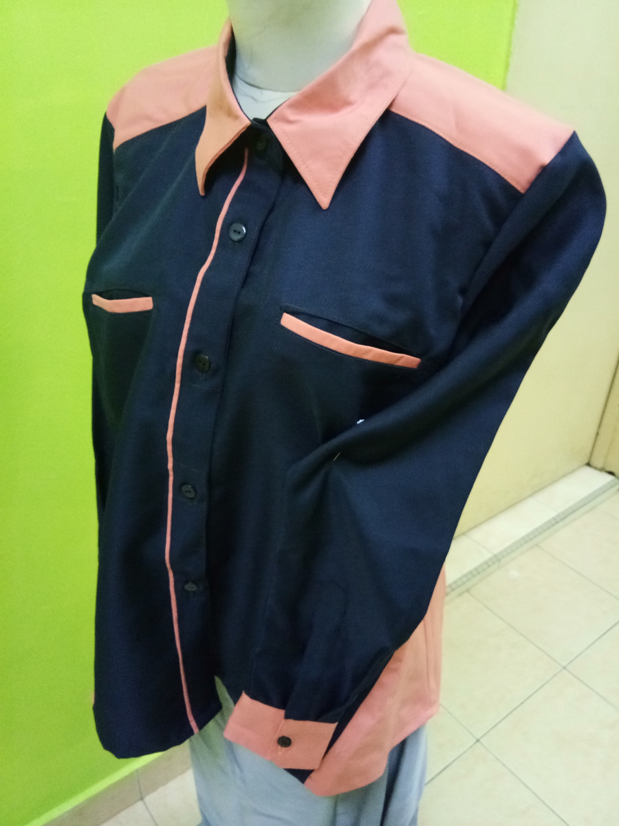 Gabungan 2 warna, tangan berkaf kemeja dan poket sorok.. Leher kontinental.