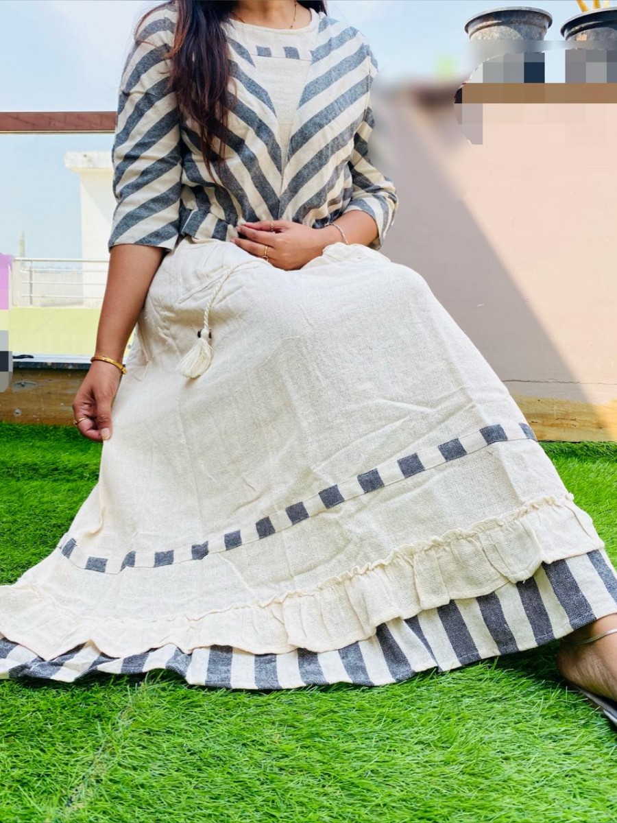 Premium jute sleeveless frock with pockets and a short jacket to complete the look..